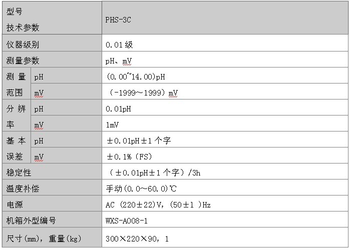 PHS-3C型精密酸度計(jì):采用大屏幕LCD段碼液晶顯示,自動標(biāo)準(zhǔn)緩沖溶液識別功能、二點(diǎn)校準(zhǔn),有手動溫度補(bǔ)償功能,配用E-201-C Q9型pH復(fù)合電極。